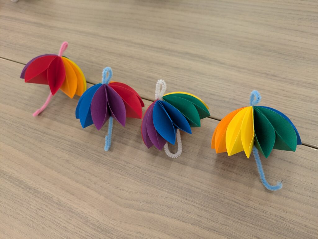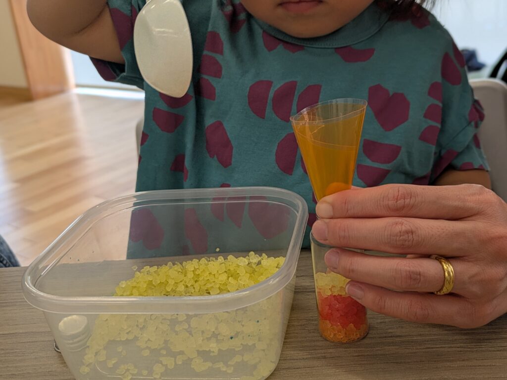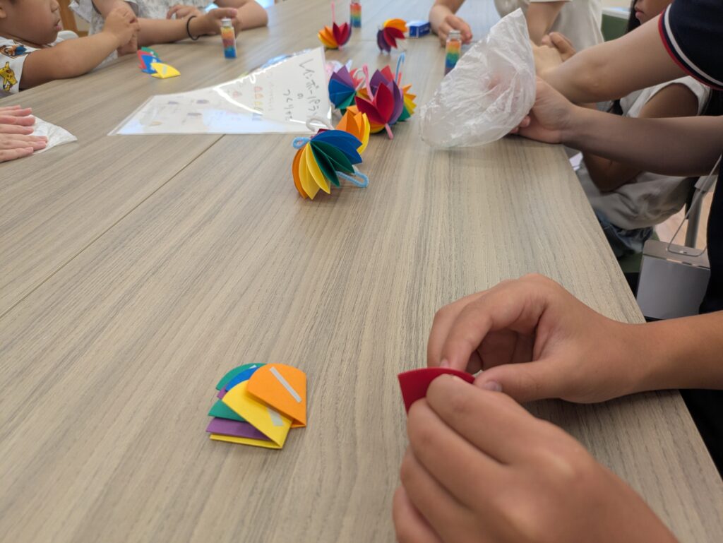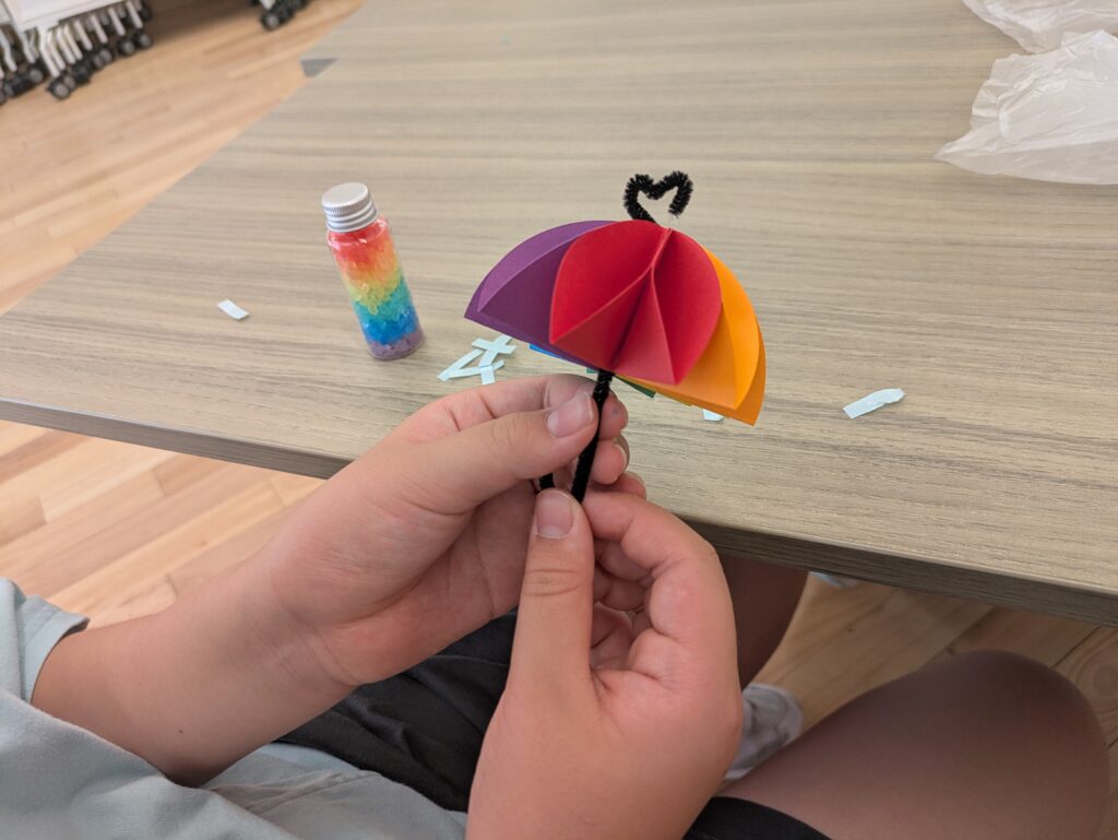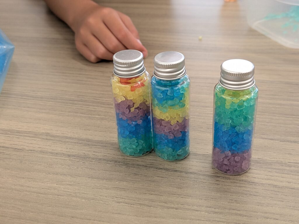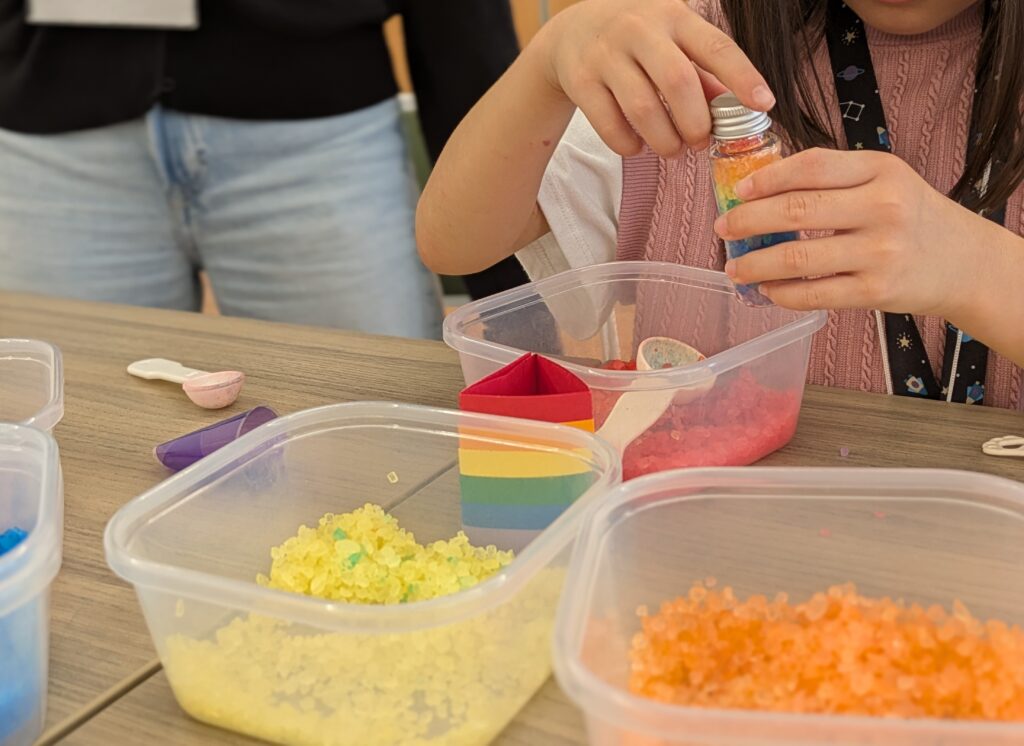まずは「レインボーバスソルト作り」と、「画用紙で作るレインボーパラソル」のワークショップ。