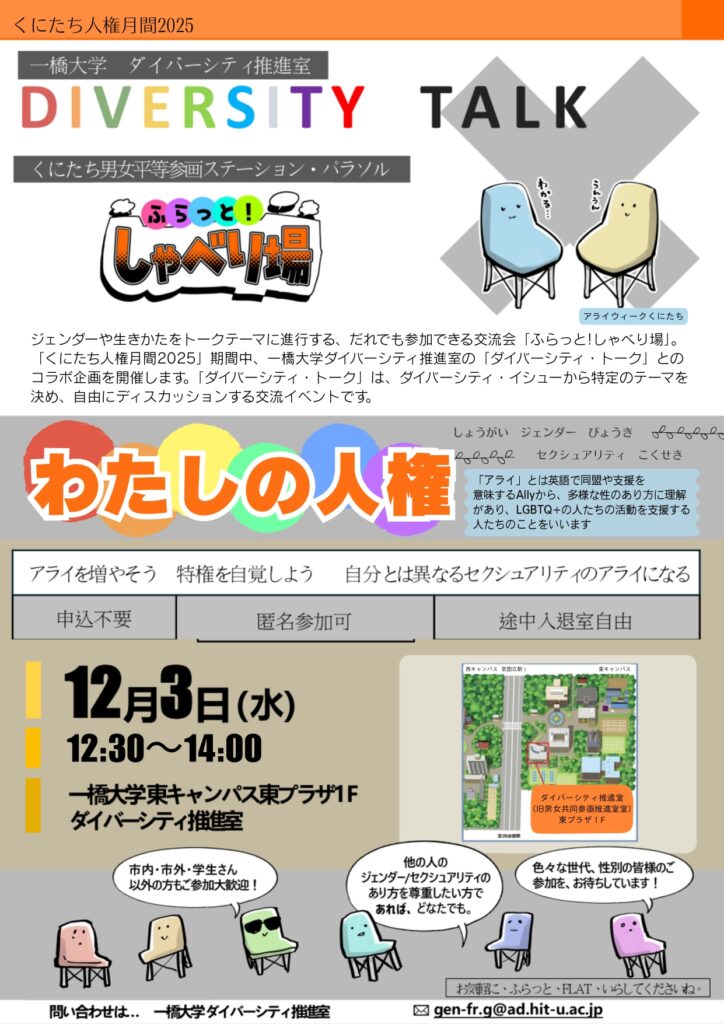12/3(水)ダイバーシティ・トーク×ふらっと!しゃべり場@一橋大学ダイバーシティ推進室