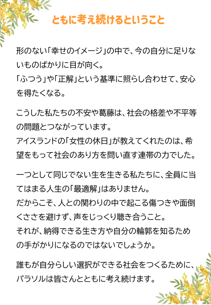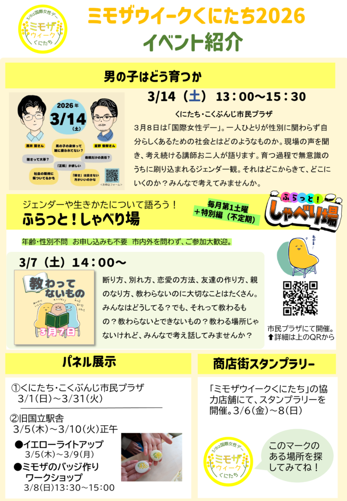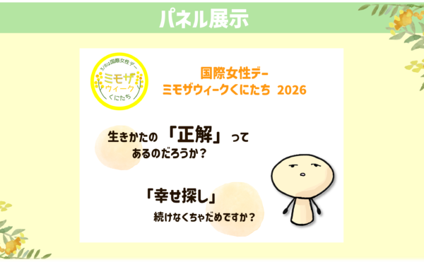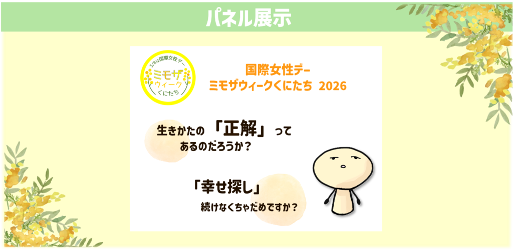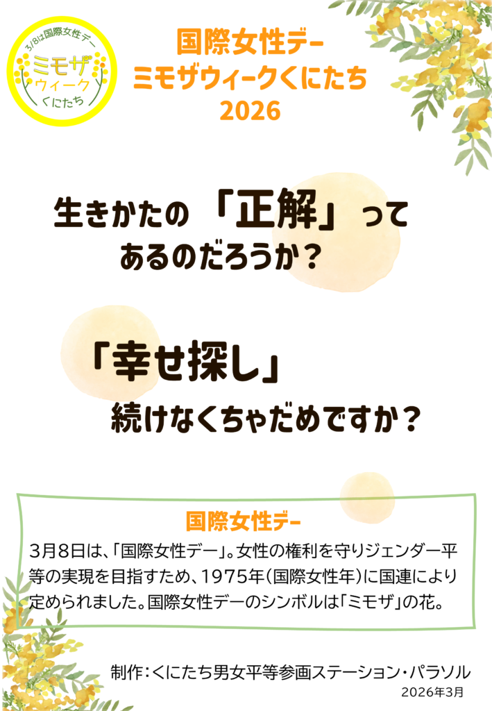 2026年3月27日 / 最終更新日 : 2026年3月27日 cs_kunitachi news (パネル展示)国際女性デー・ミモザウイークくにたち2026 「国際女性デー・ミモザウイークくにたち2026」のテーマは 「生きかたの『正解』ってあるのだろうか?『幸せ探し』続けなくちゃだめですか?」 啓発パネルの内容を画像で掲載します。 PDFファイルはこちらから