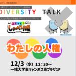 2025年12月16日 / 最終更新日 : 2025年12月18日 cs_kunitachi news 開催報告 「わたしの人権」ダイバーシティトーク ✕ ふらっと!しゃべり場 12月3日(水)パラソルの「ふらっと!しゃべり場」と、一橋大学ダイバーシティ推進室の「ダイバーシティ・トーク」のコラボ企画を開催しました。去年に続き2回目の開催です。 「ダイバーシティ・トーク」は、ダイバーシティ・イシュ […]