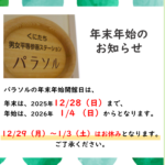 2025年12月25日 / 最終更新日 : 2025年12月25日 cs_kunitachi news 年末年始のお知らせ パラソルの年末年始開館日 年末は、2025年12/28(日)まで、年始は、2026年 1/4 (日)からとなります。 12/29(月)〜1/3(土)お休みとなります。 よろしくお願い致します。